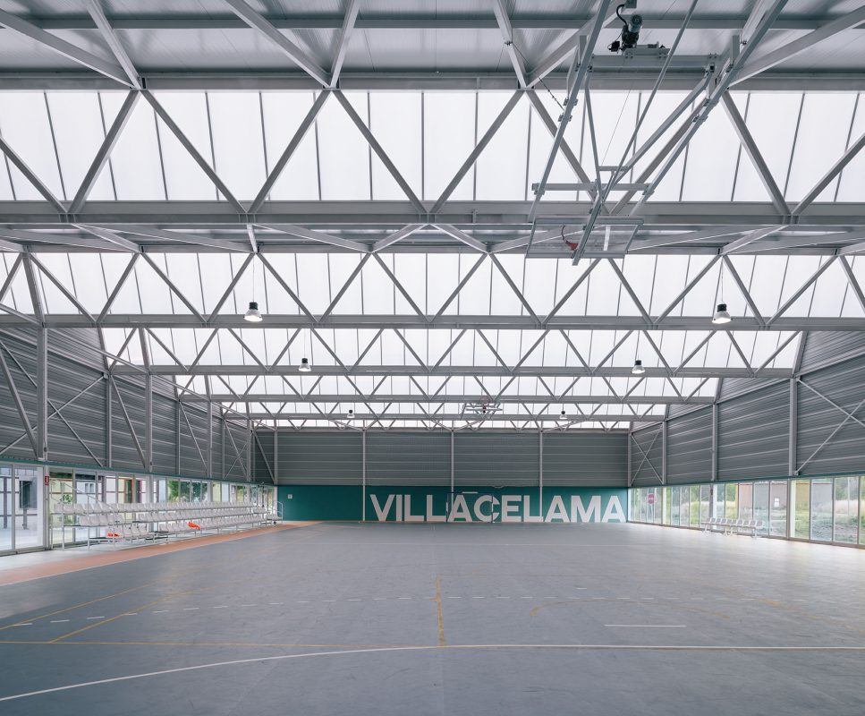 Pabellón de deportes Villacelama villacelama ARQUITECTURA QUIRÓS PRESAPablo López Presa + Itziar Quirós Director de ejecución Miguel Ángel Gutiérrez Retuerto Estructuras Alfredo Lafuente Laguna Colaboradores Mario Pérez, Ángel Sánchez Superficie 1000m2 Constructor OPHISA SL Estado Construido 2016 más información «Un pabellón de Premio CADENA SER» Fotografía Imagen Subliminal El pabellón de deportes de Villacelama nace de la idea de mantener la sensación de jugar al aire libre dentro de un espacio protegido. La luz natural, las vistas al entorno y la continuidad entre interior y exterior se convierten en los ejes de un proyecto que debía resolver, además, dos condicionantes principales: integrarse en la escala del núcleo rural y ajustarse a un presupuesto muy limitado. La solución se materializa en un esqueleto visto de cerchas metálicas que organiza estructura, fachadas y accesos. Sobre él, un cascarón de chapa minionda parece flotar sobre el zócalo acristalado, reduciendo el impacto visual del volumen y permitiendo una relación directa con el exterior. La cubierta en diente de sierra revela los lucernarios de policarbonato, que bañan el espacio con luz natural y reducen el consumo energético. Desde su inauguración en 2016, el pabellón se ha consolidado como motor de actividad para el municipio, acogiendo desde competiciones deportivas hasta celebraciones vecinales. El proyecto obtuvo un accésit en los Premios de Arquitectura de Castilla y León y forma parte de la selección de edificios leoneses recogidos en la Casa de la Arquitectura.
